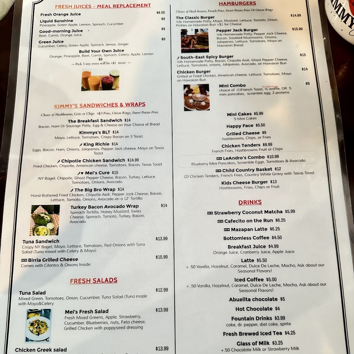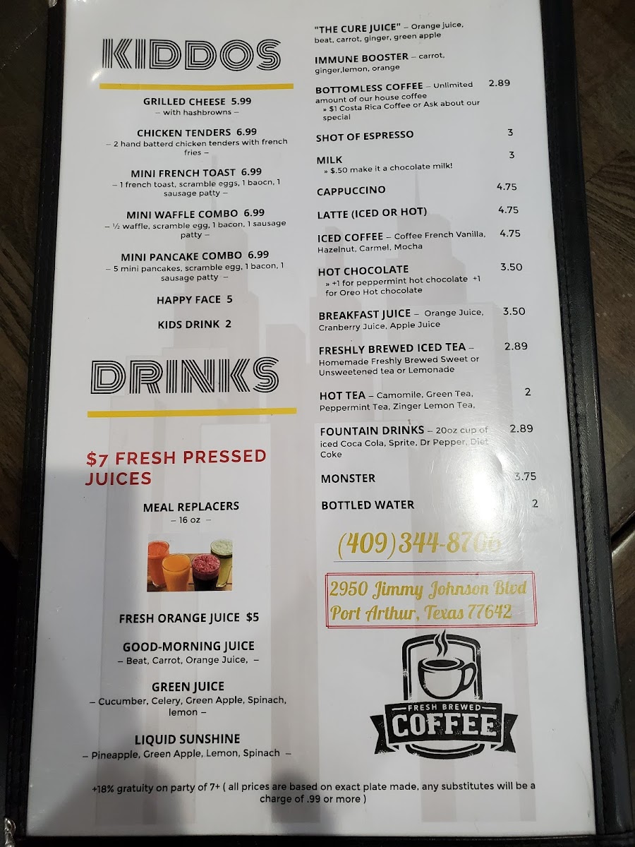 Choice of: 1 French toast, ½ waffle, or 5 mini pancakes, with scrambled egg, 1 bacon, 1 sausage
